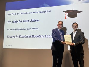 Der Preis wurde im Rahmen der Abschlussfeier der Fakultät am 24. Oktober 2024 von Christian Otto, Präsident der Hauptverwaltung in Nordrhein-Westfalen, Deutsche Bundesbank, an Dr. Arce-Alfaro verliehen. In seiner Laudatio stellte der Betreuer Prof. Dr. Christoph Hanck die herausragenden empirischen und methodischen Beiträge der Dissertation heraus. So entwickelt Herr Dr. Arce-Alfaro neue methodische Werkzeuge zur sogenannten Identifikation empirischer makroökonomischer Modelle, so dass statt reiner Korrelationen kausale Aussagen über Wirkungszusammenhänge von Größen wie Zentralbankzinssätzen und der Inflation möglich werden. Weitere Beiträge befassen sich mit den Auswirkungen der Unsicherheiten in der Geldpolitik auf die Inflation und die Inflationserwartungen. Die Kapitel der Dissertation beinhalten jeweils neue empirische Erkenntnisse und wurden bereits in verschiedenen hochrangigen Fachzeitschriften veröffentlicht.