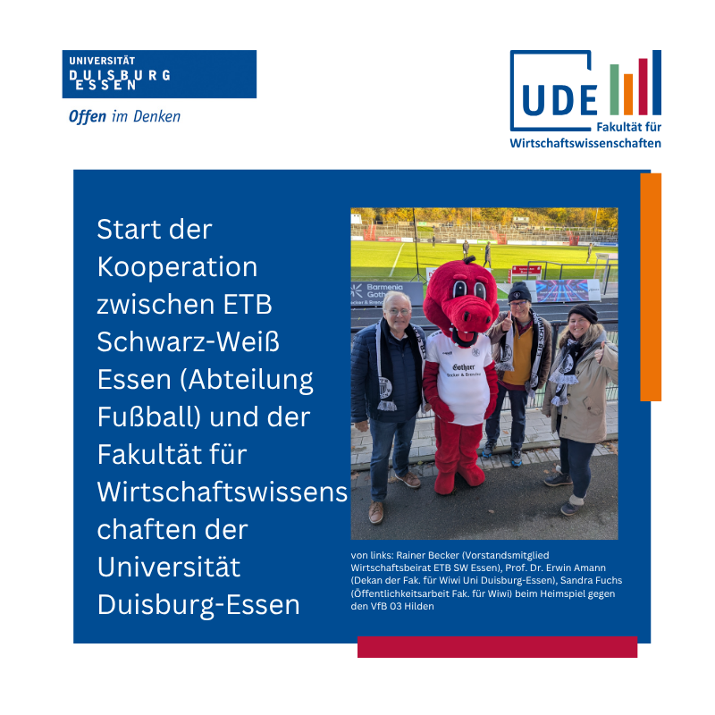 Die Fakultät für Wirtschaftswissenschaften der Universität Duisburg-Essen und die Fußballer des ETB Schwarz-Weiß Essen haben eine Kooperation geschlossen. Ziel der Zusammenarbeit ist es, die Verbindung von Wissenschaft, Sport und gesellschaftlichem Engagement in der Region zu stärken – und neue Impulse für Bildung, Gesundheit und Gemeinschaft zu setzen.