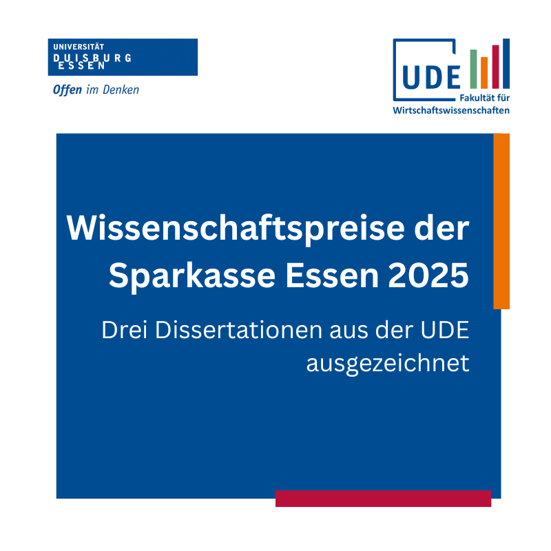 Die Sparkasse Essen hat am 19. November 2025 erneut ihre Wissenschaftspreise verliehen. Besonders freuen wir uns, dass in diesem Jahr mit Dr. Lisa Sieger für ihre Dissertation "Empirical analyses of market outcomes regarding energy efficiency valuation and renewable energy investments“ auch eine Vertreterin unserer Fakultät ausgezeichnet wurde.