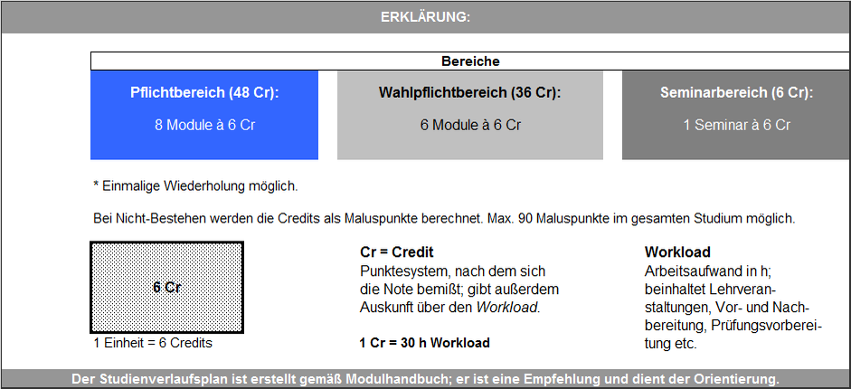 - Pflichtbereich: Pflichtveranstaltungen im Umfang von 48 Credits