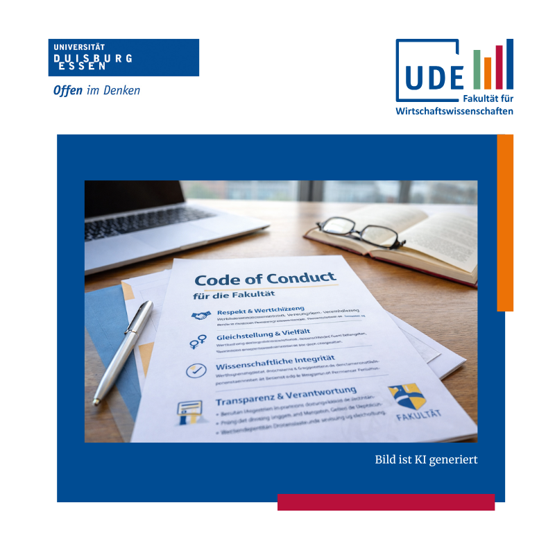 Der Entwurf des Code of Conduct wird am Dienstag, 03. Februar 2026, von 14:00 bis 14:45 Uhr im Rahmen des Jour Fixe der Wissenschaftler:innen erstmals fakultätsöffentlich vorgestellt. Die Vorstellung findet online via Zoom statt und bietet Gelegenheit, sich über die Inhalte zu informieren und den weiteren Prozess kennenzulernen. Die Einladung mit Zoom Link erfolgte über das Dekanat. Sollten Sie Interesse an einer Teilnahme haben und keinen Link erhalten haben, melden Sie sich gerne unter gleichstellung@wiwi.uni-due.de.