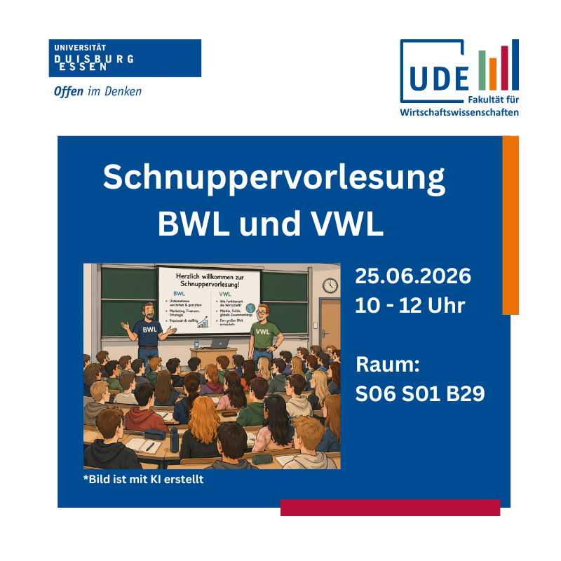 Du interessierst dich für wirtschaftliche Zusammenhänge, Unternehmensstrategien oder gesellschaftliche Fragen? Dann nutze die Gelegenheit, einen Einblick in das Studium der Wirtschaftswissenschaften an der Universität Duisburg-Essen zu erhalten!